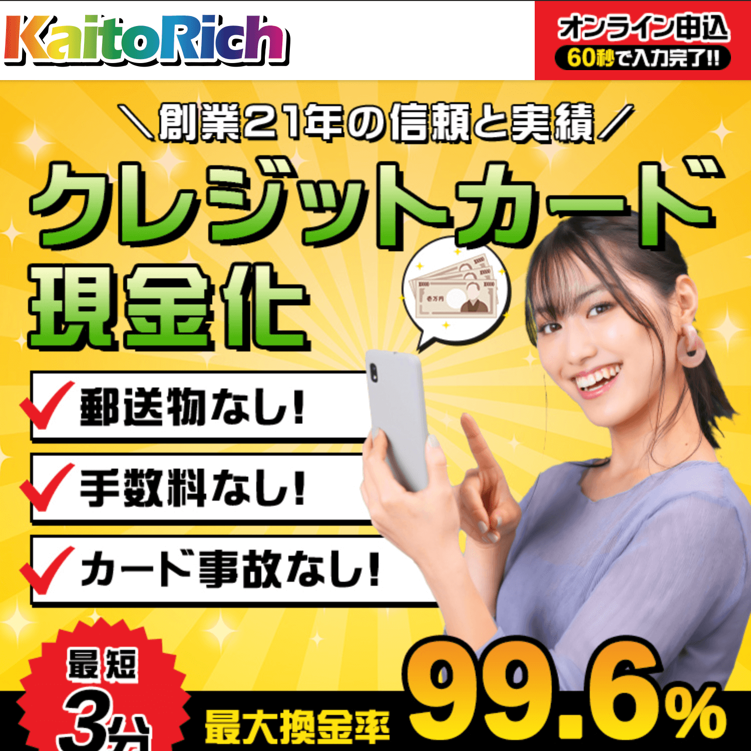 ショッピング枠が使える(VISA、mastercard、JCB、AmericanExpressなど)カードをお持ちでしたら即日で現金化が利用できます。但し、本人名義に限ります!